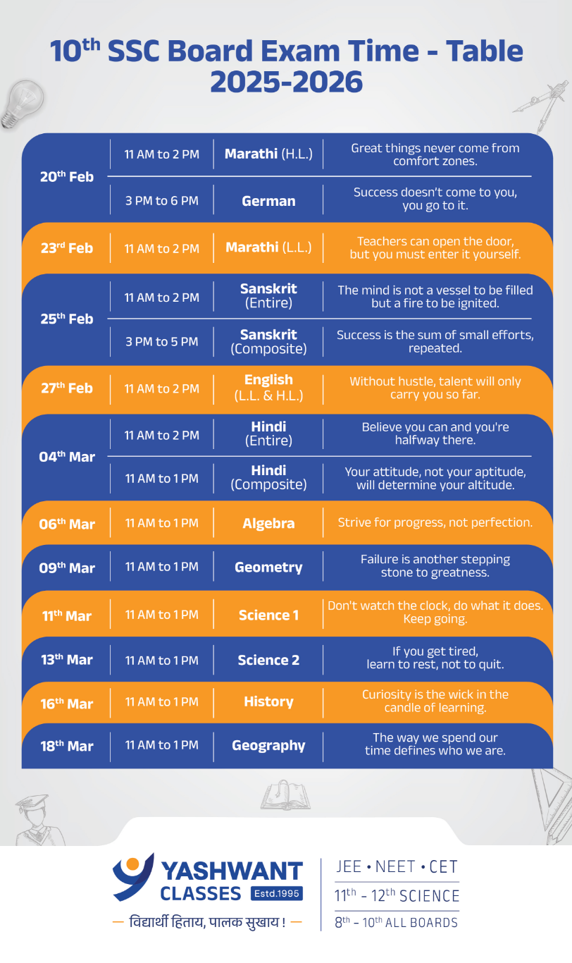 Smart preparation and steady practice are essential to scoring well in the SSC Class 10 Science exam. Focus on building conceptual clarity instead of rote learning, revise consistently, and solve chapter-wise important questions to strengthen your understanding of every unit. With a structured approach and the right support from Yashwant Classes, you can approach the SSC board exams with confidence and aim for outstanding results.